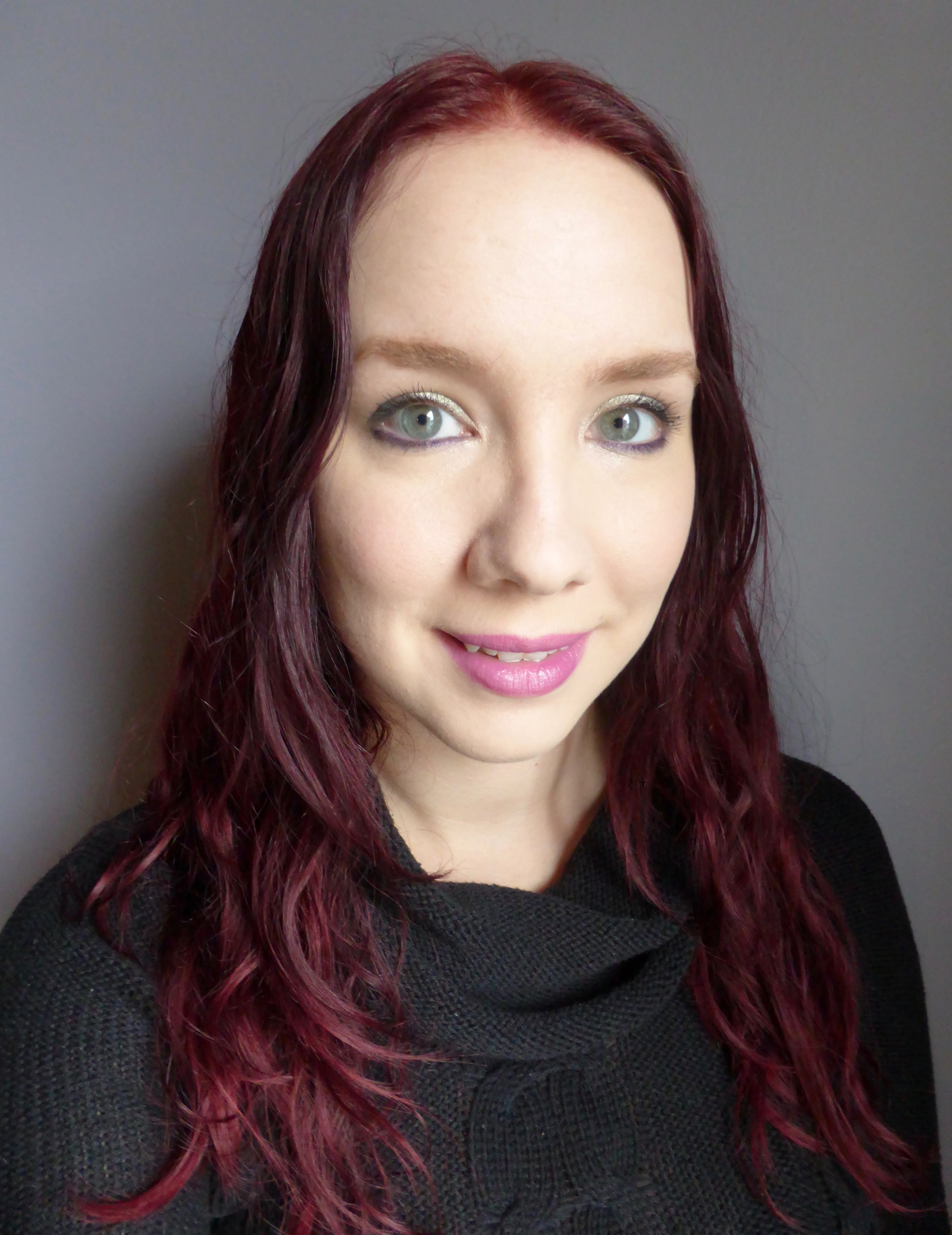 Eyes: Urban Decay Primer Potion (original). Makeup Geek Foiled Eyeshadow in Charmed (all over lid). Urban Decay Naked Smoky Palette – Combust (transition/crease), Dagger (blended into outer corner), Smoulder (under eye), and High (inner corner of eye). Urban Decay 24/7 Glide-On Pencil in Psychedelic Sister (waterline). Too Faced Better than Sex Mascara (lashes).