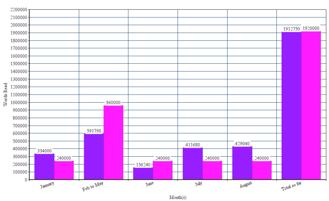 The pink represents the goal for each month(s) and the purple is what I actually read. The final column shows my progress compared to where I should be with my yearly goal (reading 240,000 words per month). I’m nearly caught up to where I should be to meet my goal! Thank you summer reading!!